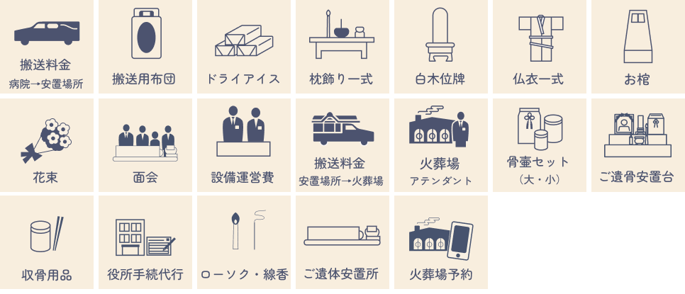 葬儀社である当社(セレモニーYURI)が頂戴する費用については原則、すべて含まれています。